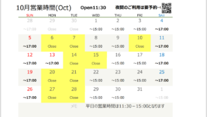 Home お知らせ 10月の営業のご案内 10月の営業のご案内 2025.09.29 お知らせ ・毎週月曜火曜は定休日です(祝日は営業) ・夜の部(水-金19:00-22:00)ご利用の際には予約をお願いいたします https://www.instagram.com/p/DPLX8X3kZiE/