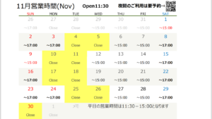 Home お知らせ 11月の営業のご案内 11月の営業のご案内 2025.10.25 お知らせ ・毎週月曜火曜は定休日です(祝日は営業) ・夜の部(水-金19:00-22:00)ご利用の際には予約をお願いいたします https://www.instagram.com/p/DPLX8X3kZiE/