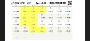 Home お知らせ 2月の営業のご案内 2月の営業のご案内 2026.01.24 お知らせ ・毎週月曜火曜は定休日です(祝日は営業) ・夜の部(水-金19:00-22:00)ご利用の際には予約をお願いいたします https://www.instagram.com/p/DUHNUtCk1j0/